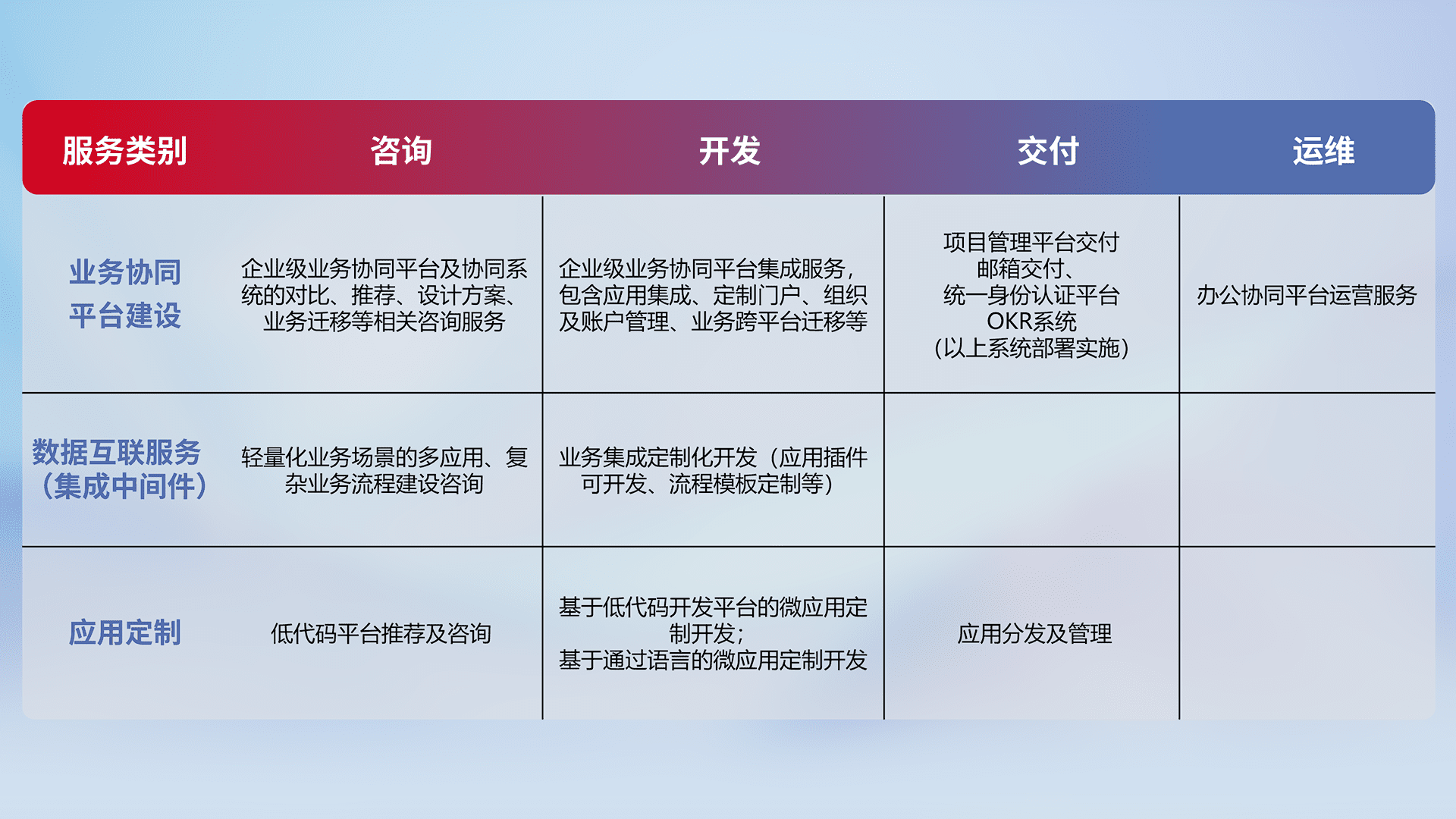 针对钉钉、、、、企微、、、IDaas等平台级产品提供产品的规划、、方案、、、交付、、、定制化开发等服务,,,实现如统一协同办公、、、、智能客户服务、、、混合会议管理、、、智能数据查询、、、、等业务场景,,,,实现数字化转型。。